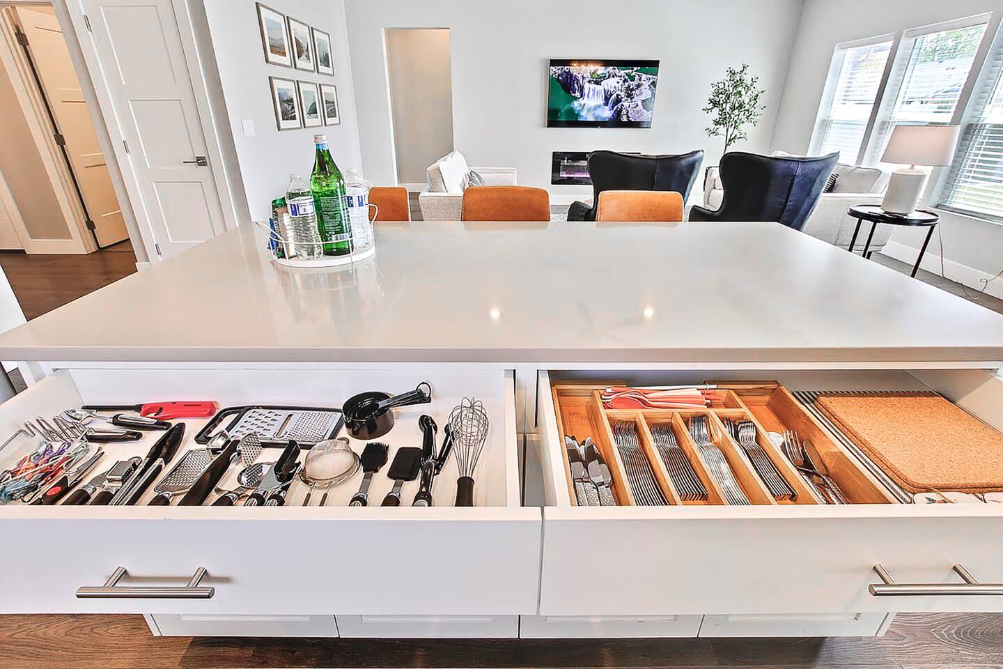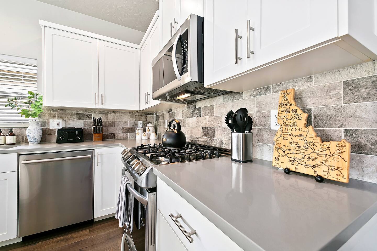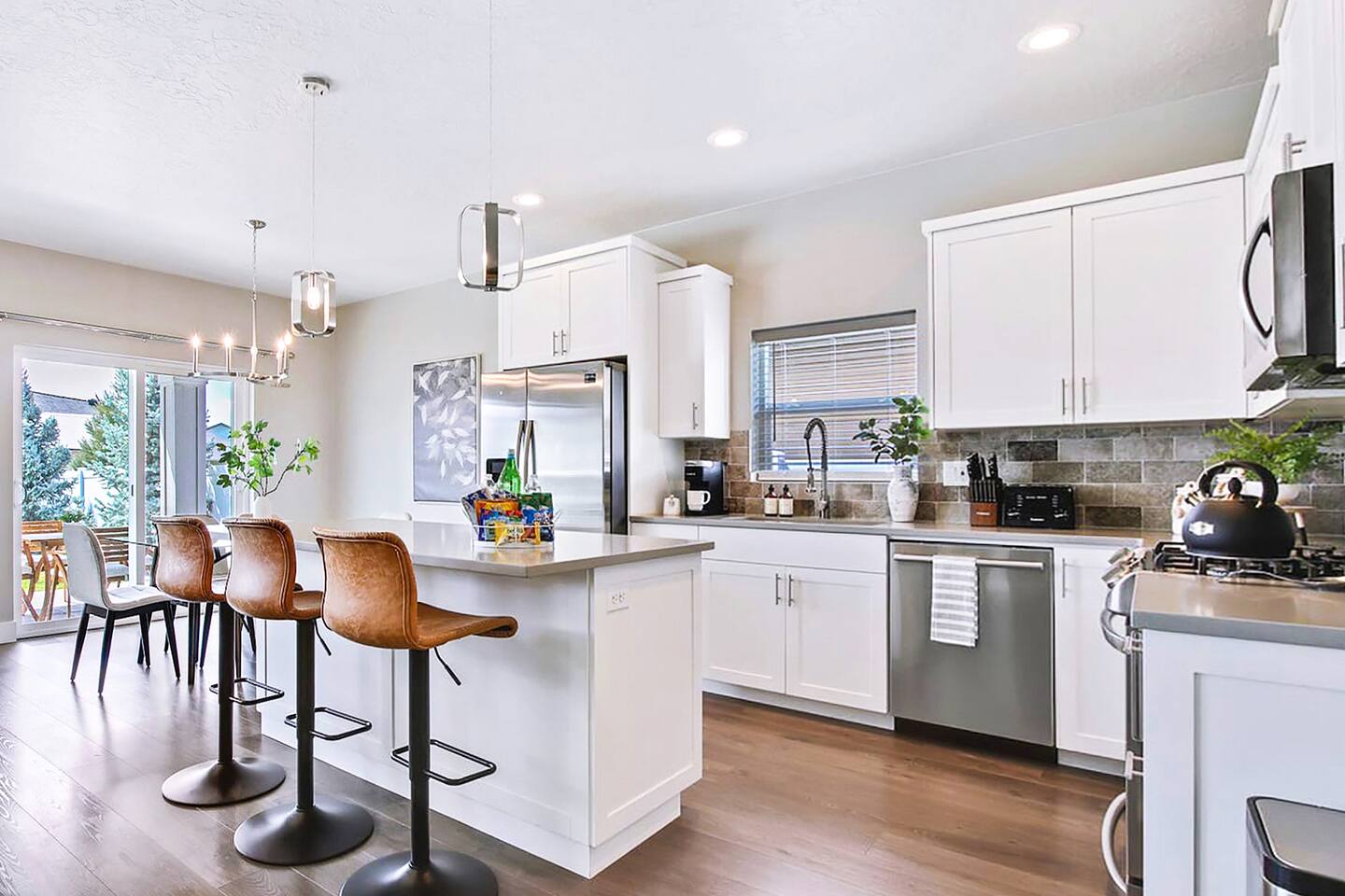 SLEEPING ACCOMMODATIONS (8-10 guests): Bedroom 1 (Suite) - King bed, pack-&-play Bedroom 2 - Queen bed Bedroom 3 - Queen-over-Queen bunkbed Living Room - Queen self-inflatable air mattress NOTE: Queen self-inflatable air mattress provided for groups of 9-10 BEDROOMS: Each of our three bedrooms provides high-quality, comfortable mattresses that provide a right level of support and firmness, ensuring you have a restful sleep experience. Carefully selected soft and supportive pillows with varying level of firmness to accommodate different sleeping preferences. Crisp and clean linens, soft sheets, and cozy duvets for enhanced comfort and inviting atmosphere. For your infant we have included a pack-&-play crib with mattress and sheets, and blanket, as well as a new highchair with tray and a basket of toys. Adequate storage space will allow you to neatly organize their belongings during their stay. Additionally, master bedroom equipped with large 60β Smart Roku TV, and the split bedroom design offers privacy. KITCHEN/DINING: In the comfort of this home, you will find a fully stocked kitchen with every necessity provided to make delicious home-cooked meals, including baking supplies. This includes an electric tea kettle, toaster, Keurig coffee machine, K-cups, every imaginable utensil, cutting boards, mixing bowls, baking sheets and dishes, pots and pans, a full set of dinnerware, childrenβs dishes, kitchen towels, paper towels, cleaning supplies, and various spices and other necessities in the cupboard. The dining area comfortably seats 9 people: 6 at the dining table and 3 at the kitchen island. Enjoy complimentary tea, coffee, and a 'welcome' snack tray. LIVING AREA: A large 65" Smart Roku TV is available in the living room, along with high-speed Wi-Fi Internet and access to all your streaming channels! Additionally, there's a dedicated workspace equipped with a desk, office chair, lamp, and ample natural light from the windows. In one of the closets, you will find a stack of family-friendly board games. GARAGE: 21' wide x 18' deep will accommodate 2 vehicles. SUPPLIES: Whether you book for one day or a month, and regardless of whether you're staying alone or with the maximum number of guests allowed by house rules, the same limited supply of kitchen, bathroom, and laundry essentials will be provided. However, these will not be replenished during your stay. We recommend bringing any additional personal or specific items you regularly use with you. NEIGHBORHOOD: The house is nestled on a kid-friendly private street within a quiet and safe neighborhood in central Meridian. Just minutes from highway I-84, it offers quick and easy access to Boise, Eagle, Nampa, Kuna, and Garden City. Within walking distance, you'll find Fred Meyer supermarket, Walgreens, and a variety of small restaurants and shops. Kleiner Memorial Park is conveniently located just five minutes away, situated across from The Village at Meridian, the area's most popular shopping, dining, and entertainment destination. The park offers a wide selection of activities for individuals and families to enjoy. Meanwhile, The Village features upscale apparel and specialty retail stores, as well as fine dining options like Texas de Brazil, Kona Grill, and Yard House. Visitors can also explore cafes, Big Al's bowling alley, arcade games, a cinema, and enjoy seasonal concerts and an ice rink. Designed with European-style architecture, The Village streets surround a park setting complete with a children's play area and a choreographed fountain offering hourly shows. Eagle Road, a high-density commercial strip, offers abundant shopping, dining, and amenities. Here, you'll find chain retailers such as Target, Bed Bath & Beyond, World Market, Lowe's, and major grocery stores like Albertsons Marketplace, Trader Joe's, and the local favorite Boise Co-op specializing in organic and GMO-free foods. The strip is abundant with eateries from fast-food favorites such as In-n-Out, Chick-fil-A, Dave's Hot Chicken, Costa Vida, Freddy's, and The Habit to fine dining at Land Ocean, Hook & Real, Crave Kitchen & Bar, and Coyne's Restaurant & Bar. FAMILY FUN: The seasonal Roaring Springs Water Parkβranked the nation's eighth-bestβfeatures slides, rides, wave pools, and attractions for all ages. Year-round excitement awaits at Wahooz Family Entertainment Zone, offering laser tag, an indoor ropes course, virtual reality, arcade games, bumper cars, outdoor mini golf, and bumper boats. The newly opened Top Golf facility is also just minutes away. Boise historic downtown is only 20 minutes away and has something for everyone. Visitors will find boutique shops, fine dining, theaters, zoo, discovery center, breweries, parks, coffee shops, pedestrian and bike friendly Boise River greenbelt, night life and lots of other activities. GETTING AROUND: Transportation could be accomplished by Uber or Lift, but a car is recommended. Restaurants ~ 5 min Shopping ~ 5 min Grocery ~ 5 min The Village at Meridian ~ 5 min Big Al's Bowling, Arcade, and Sports Bar - 5 min Vertical View Climbing Gym ~ 7 min St. Lukes Hospital ~ 9 min Wahooz Family Fun Zone ~ 8 min Top Golf ~ 10 min Roaring Springs Water Park ~ 11 min Boise River Greenbelt ~ 10 min Airport ~ 17 min Boise Downtown ~ 20 min Lucky Peak Reservoir ~ 26 min Hiking, skiing, rock climbing ~ 20-45 min St. Chapelle Winery ~ 39 min The Springs (Idaho City) ~ 60 min Bogus Basin Ski Resort ~ 60 min Lake Cascade ~ 1 hr 30 min Tamarack Ski Resort ~ 2 hrs 17 min McCall, ID ~ 2 hrs 21 min Sun Valley, ID ~ 2 hrs 52 min
